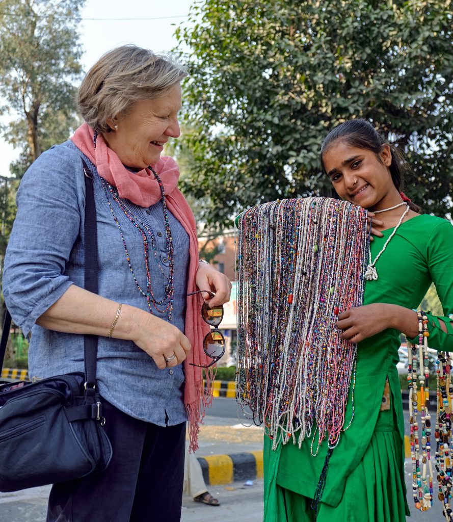 She stands on a street corner in the wealthy district of New Delhi, near the posh hotels which charge the equivalent of 50 necklaces for a simple continental breakfast.