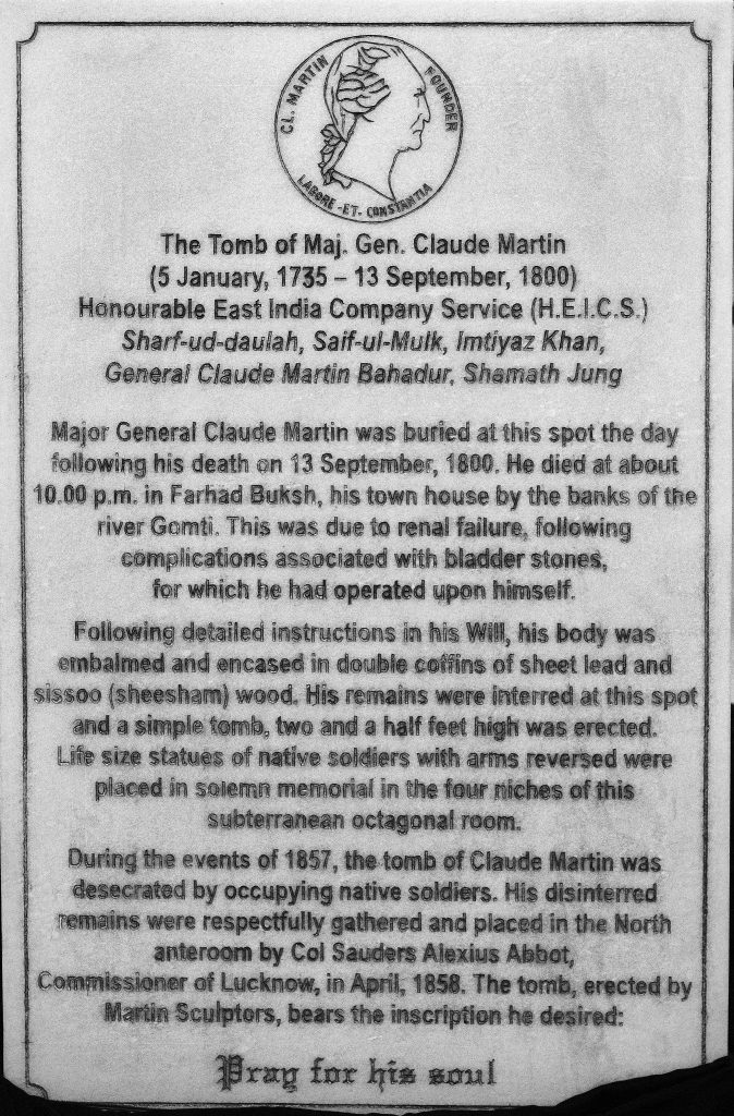 Claude Martin was a Frenchman who had served in the French East India Company. After their defeat by the British East India Company he became a British officer and rose to high rank in the BEIC army. Aside from being a brilliant military strategist, he was also an architect, doctor and “bon viveur” with close connection to the Nawad.