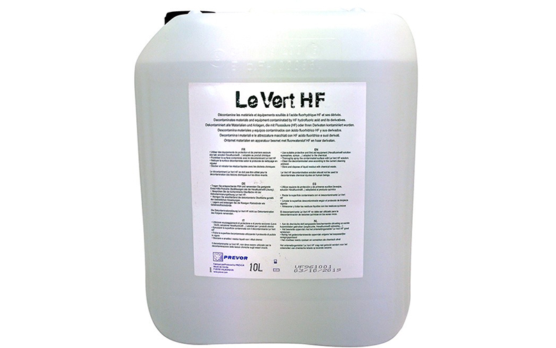Descontaminante químico líquido contra el ácido fluorhídrico o sus derivados. El ácido fluorhídrico está presente en la mayoría de las mezclas químicas utilizadas en el tratamiento de superficies.