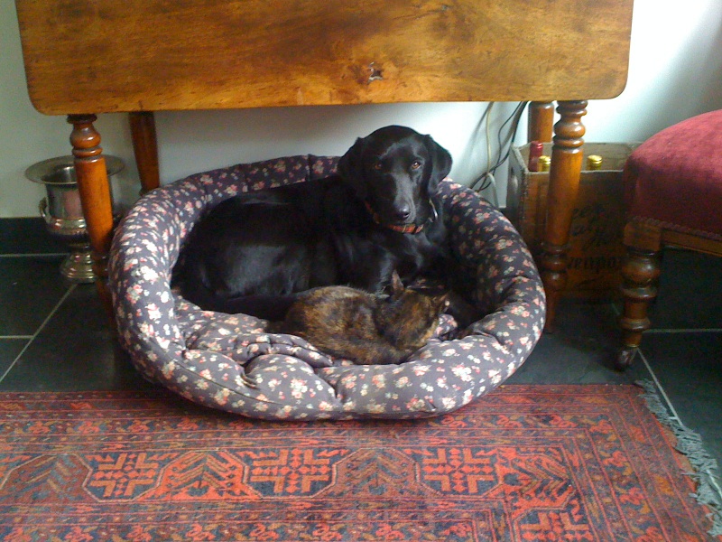 Interestingly my cat and dog, on a cold rainy Bank Holiday have learned compatibility, keeping warm together in the basket – cosier when there’s two!
