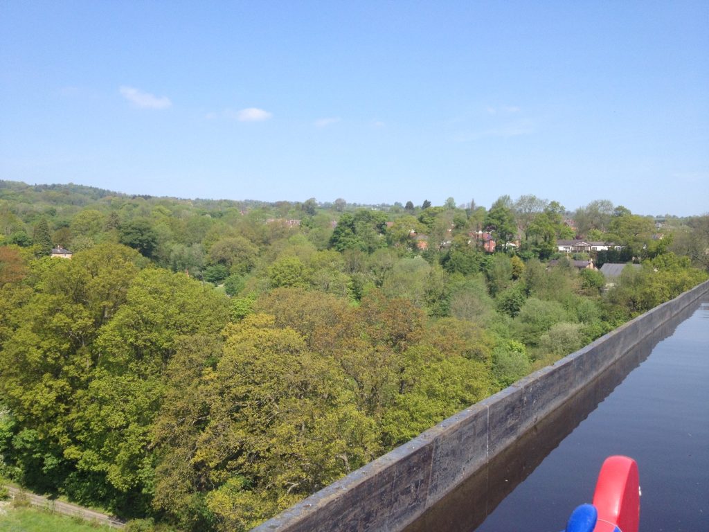 Lewis and Jess were cruising the canals of Cheshire and Wales on-board a classic narrow boat. The picture is the view from an aqueduct, near Llangollen.