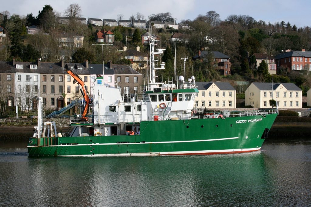 Shown in the photograph is the Celtic Voyager as it passes Cobh in county Cork, the Celtic Voyager is a 31.4 m multi-purpose research vessel powered by a 650 KW engine, with a top speed of about 10 knots. In order to better manoeuver the vessel it is also fitted with a bow thruster along with precision navigation equipment, so there’s never an issue about having to navigate by the stars! The ship is fitted with wet, dry and chemical laboratories, consisting of numerous laboratory and geophysical equipment. Oceanographic sensors and data loggers include a thermosalinograph, turbidity meter, fluorometer, ADCP, dual frequency depth sounder and RoxAnn. Along with this there is the capacity to carry out beam trawls and surface sediment sampling (second photograph showing the ‘day grab’ system on board). The Celtic Voyager can accommodate 6 – 8 scientists and has a maximum range of 17 days, depending on the stock of fresh water on board. The Celtic Voyager came into service on the 15th September 1997 as a replacement for the R.V. Lough Beltra (1978-1997), which was a 21-metre converted trawler. The design of the Celtic Voyager means that is can be easily changed and modified to suit different operational objectives such as fisheries collection, geophysical, oceanographic, and environmental data collection.