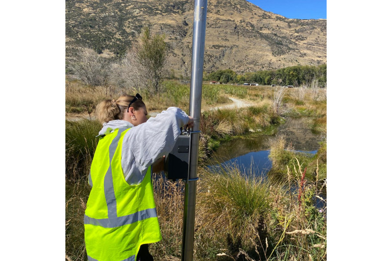 In this photo, Holly is removing the old vanwaltDataHub with a solar panel mounted on a post.
