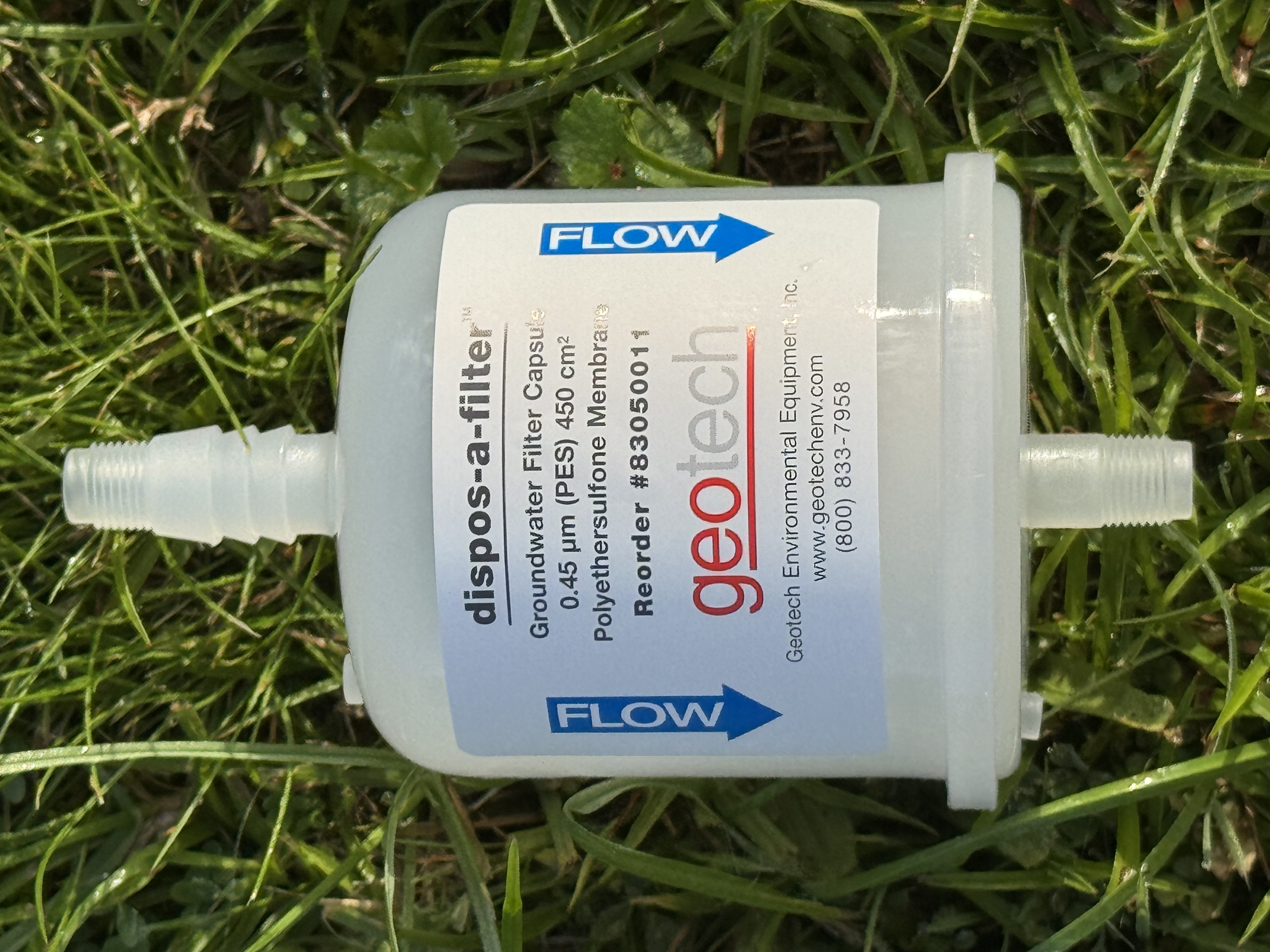 On site in-line filtration is required when sampling or monitoring groundwater for contamination and metals. These In-Line Filters have 0.45 micron pores. It is more economical to use the larger filters when the water is dirty. The filters are hallmarked and the larger filters have been tested for over 100 parameters.
